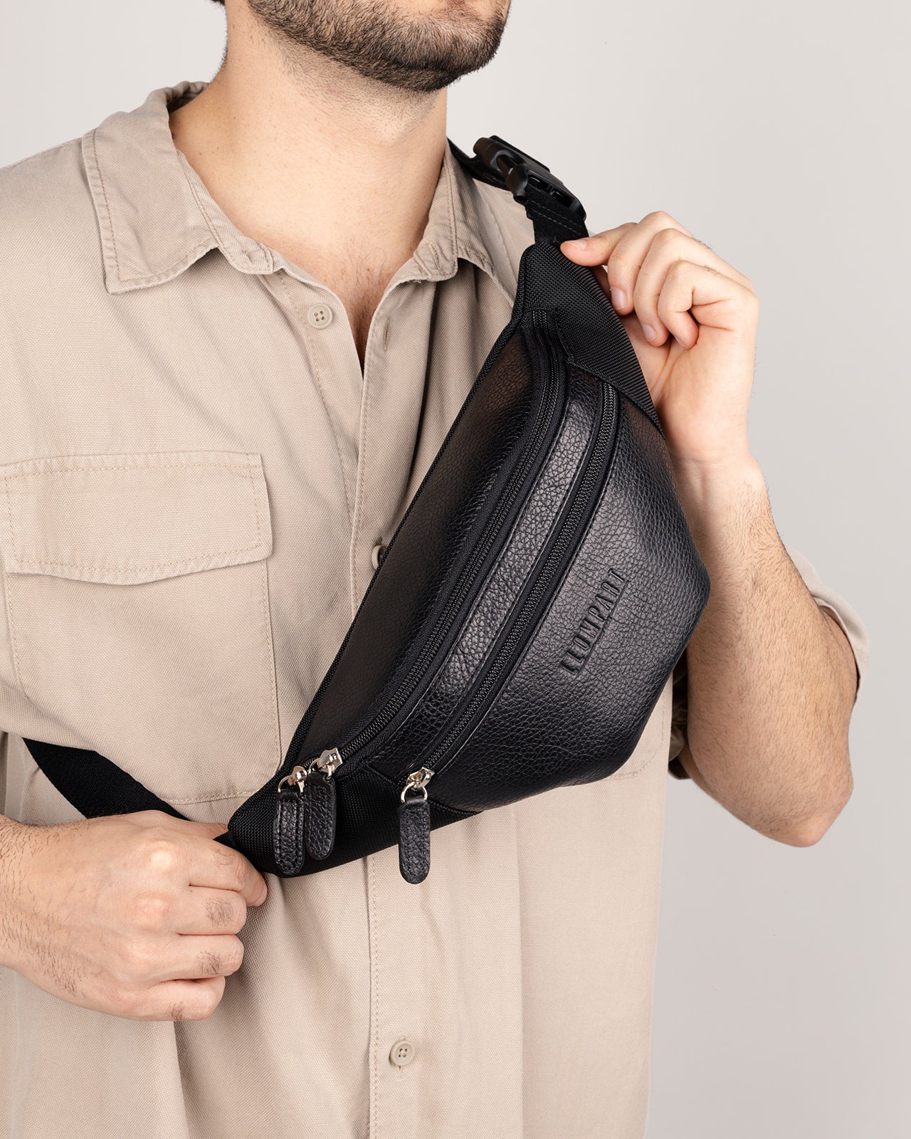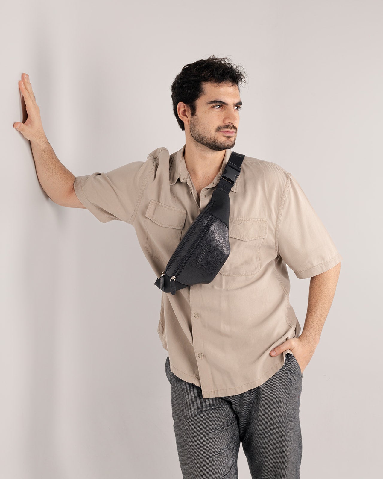 Cangurera con silueta clásica confeccionada con piel genuina suave al tacto, con acabado graneado y diseño elegante. Su estructura favorece el traslado y el resguardo de tus pertenencias personales.