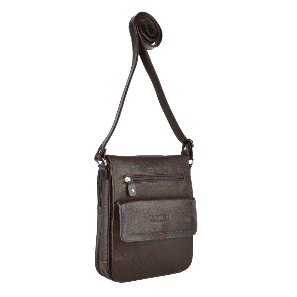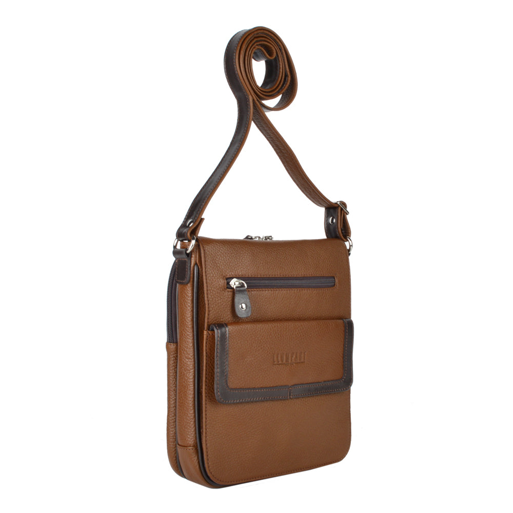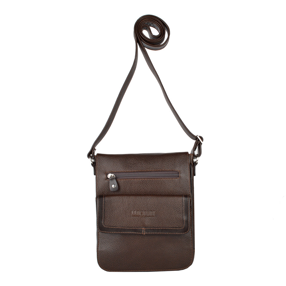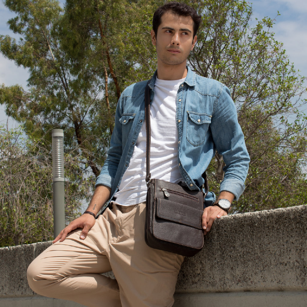 Mariconera de piel para hombre. Su diseño permite transportar artículos personales separados en diferentes compartimentos de manera ligera y cómoda. Además cuenta con una tapa con broche de imán. El diseño de la mariconera brinda espacios para tarjetas, accesorios pequeños, así como bolsillos ocultos dentro del forro. El diseño de la mariconera encaja con una vestimenta de trabajo y casual.