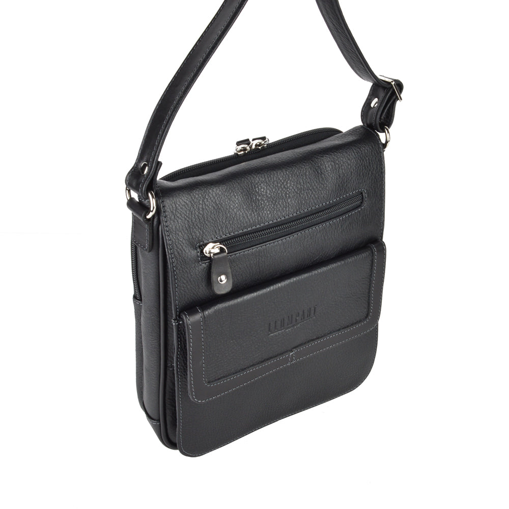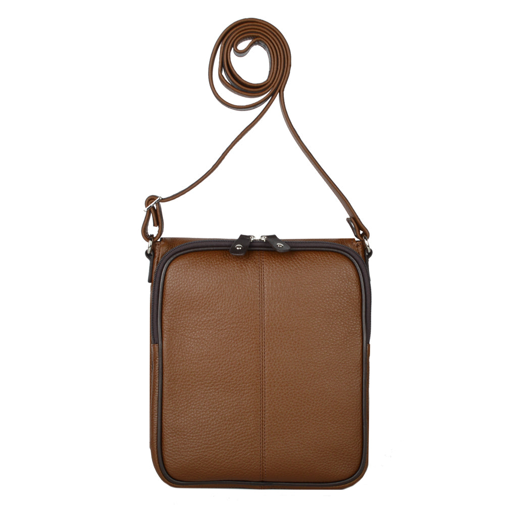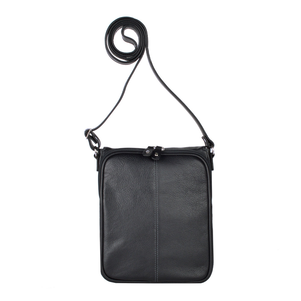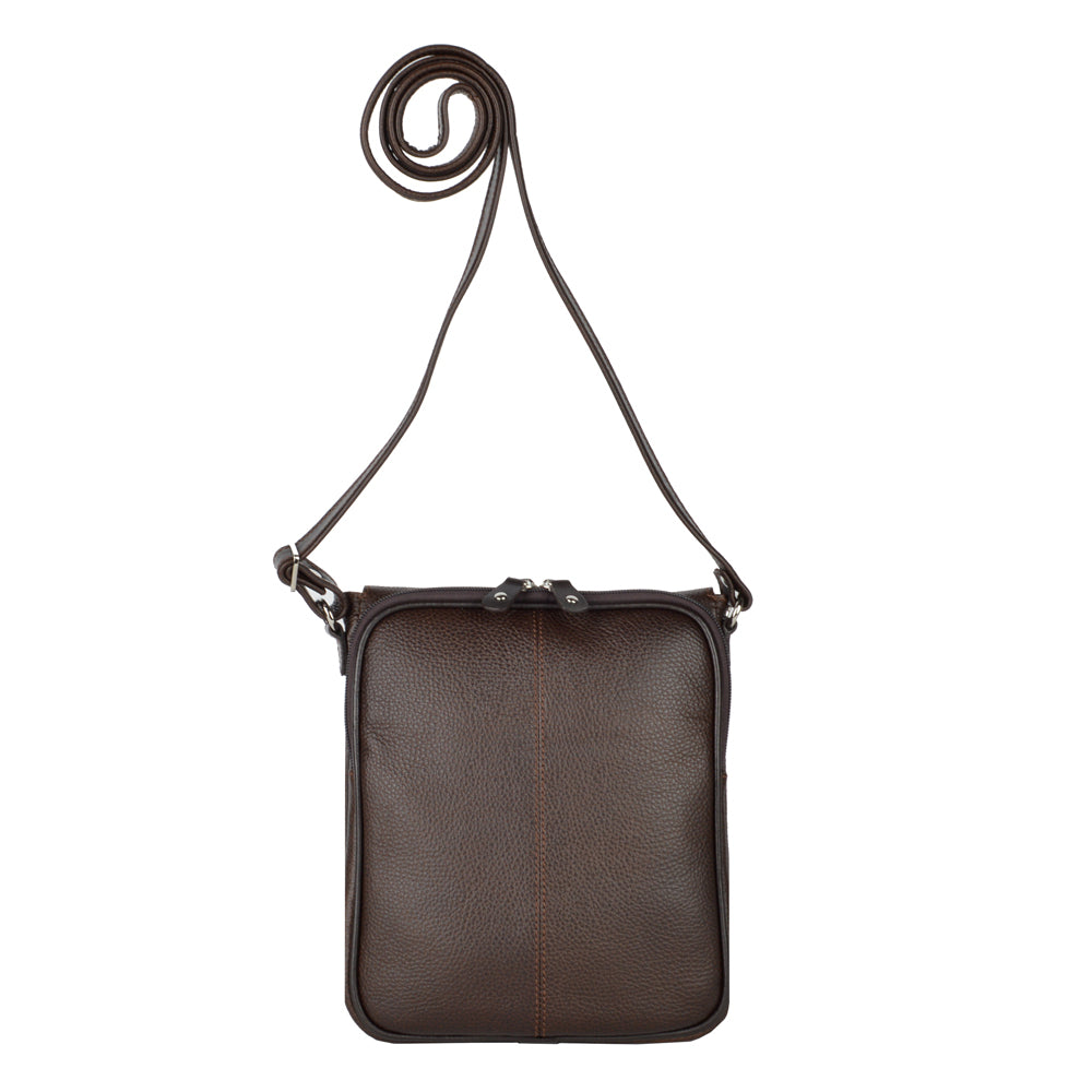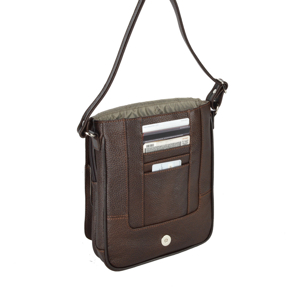 Mariconera de piel para hombre. Su diseño permite transportar artículos personales separados en diferentes compartimentos de manera ligera y cómoda. Además cuenta con una tapa con broche de imán. El diseño de la mariconera brinda espacios para tarjetas, accesorios pequeños, así como bolsillos ocultos dentro del forro. El diseño de la mariconera encaja con una vestimenta de trabajo y casual.